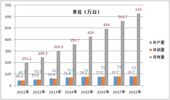 2011-2018年中国电梯年产量、销量、保有量统计情况