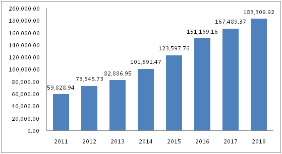 图2:2011-2018年中国保险业总资产(单位:亿元)