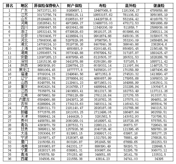 表1:2018年全国各地区原保险保费收入情况表(单位:万元)