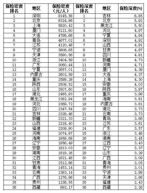从保险深度来看,并不存在明显的区域性差异。排名前十位的地区是吉林、北京、黑龙江、河北、宁夏、深圳、山西、甘肃、四川、新疆,地区分布很平均。后十位是江西、辽宁、山东、广西、青海、贵州、宁波、天津、福建、西藏,地区分布也较为平均。东部地区在保险深度上并没有表现出明显优势,主要因为分子(保费收入)和分母(GDP)都很高,而西部则总体都低。保险深度主要衡量保险业在该地区经济中的地位。