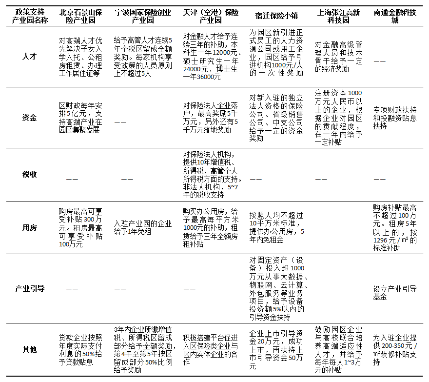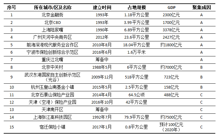 目前,我国各地专门针对保险业建立的产业园区为数并不多,主要有成立于2014年的北京石景山保险产业园,成立于2016年的宁波国家保险创业产业园、天津(空港)保险产业园、成立于2017年的宿迁保险小镇,另外部分金融以及高新技术园区也十分重视保险业的产业聚集,比如成立于1992年的上海张江高新科技园,成立于2014年的南通金融科技城等。