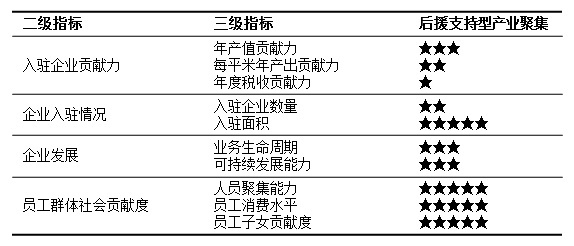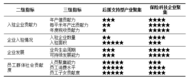 首先,产业园建立的初衷是形成产业聚集(我国部分产业聚集地情况概览详见表1)。产业聚集的第一步就是要实现招商引资,需要在构建一套完整的分析体系的前提下进行论证。不仅要完成园区硬体地产入驻率论证,也包含了入驻企业税务贡献能力、业务生命周期、可持续发展能力及员工群体社会贡献度等集聚效益指标(详见表2)的分析评价。以此为基础,可形成保险产业园发展的基础目标或者称为初级目标。