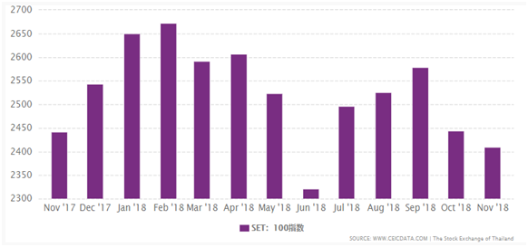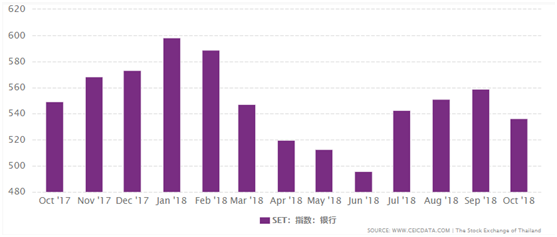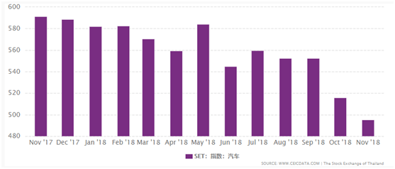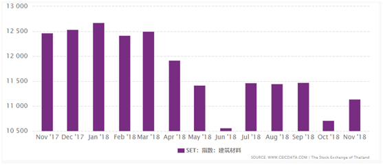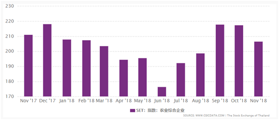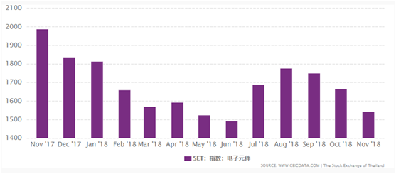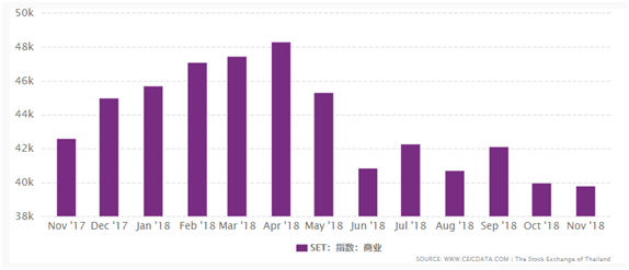 从泰国几大行业板块来看,农业和银行业指数表现较为接近,2108年6月处于低谷,随后近半年时间保持一定幅度的增长。汽车行业指数从2018年5月份开始,呈现整体下滑态势,半年时间下降幅度约17%。商业指数从2018年4月份开始,开始出现较大幅度的下滑,从4月份到11月份,下降幅达近20%。建筑材料指数于2108年6月明显下滑,随后几个月处于低位徘徊。电子元件指数同样于2108年6月处于低位,短暂小幅上涨后呈现下滑趋势。