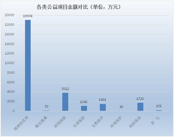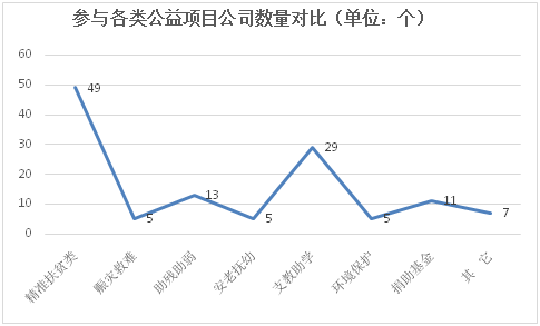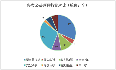 其中,精准扶贫类项目共计97个,占所有项目总数的三分之一。另外,支教助学类项目92个、助残助弱项目35个、安老抚幼项目27个、捐助基金项目18个、赈灾救难项目13个、环境保护项目7个、其他类项目19个。