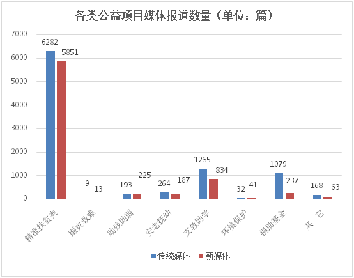 对于保险行业来说,他们所做的公益项目同样引起了各大媒体的关注,尤其是随着全媒体的发展,让公益传播效果得到了大大提升,也更好地提升了参与公益企业的品牌形象。根据统计数据显示,2018年精准扶贫类公益项目最受媒体关注,6282家传统媒体以及5851家新媒体对97个精准扶贫项目进行了报道。另外,媒体对支教助学类公益项目以及捐助基金类公益项目关注度也很高,1265家传统媒体和834家自媒体对92个支教助学项目进行了报道,1079家传统媒体以及237家自媒体对18个捐助基金项目做了报道。