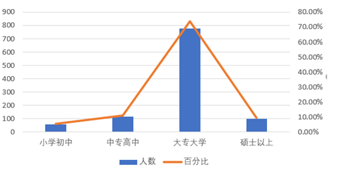 73.88%的受访者受教育水平集中在大学和大专阶段,总体受教育程度高于全国平均水平。