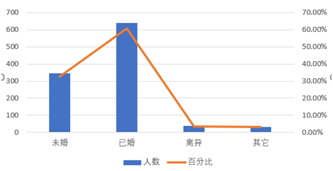 调查对象中,未婚的占32.73%;已婚的占60.72%;离异的占3.51%;其他占3.04%。已婚人士占据半数以上,是公益行业的主力军。