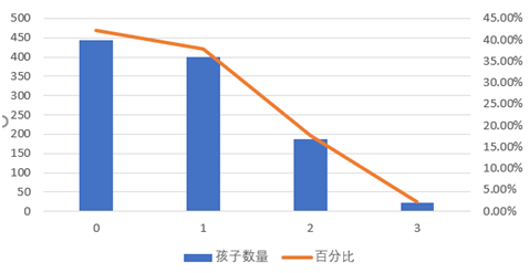 本次调查发现,没有孩子的家庭占42.13%;有孩子的占57.87%,其中只有一个孩子的家庭占37.95%,有两个孩子的家庭占17.74%,有三个及以上孩子的家庭占2.18%。
