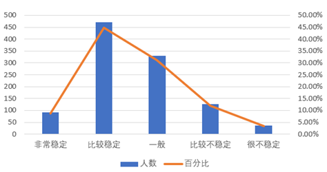 收入稳定性对于保障和心理安全感具有重要影响。本次调查显示,绝大多数(84.39%)受访者的收入稳定性在“一般”。但也有超过15%的受访者表示收入“比较不稳定”和“非常不稳定”,占比约为1/7,值得特别关注。