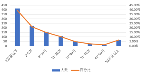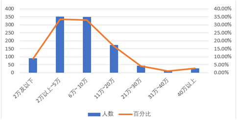 本次调研的受访者中,近66%个人去年总收入在5万元(相当于月工资4000元)及以下,年收入超出10万元的仅占约6%,总体收入较低。