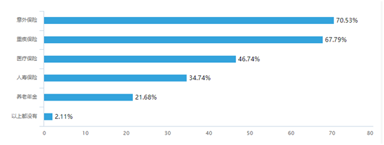 本次调研受访者中,购买过商业保险的占比44.14%,没有购买过的占比55.86%。商业保险参保率不足1/2,且绝大多数(82.32%)年花费在1万元以下。从购买的险种来看,主要为意外险(70.53%)和重疾险(67.79%)。