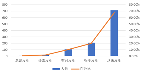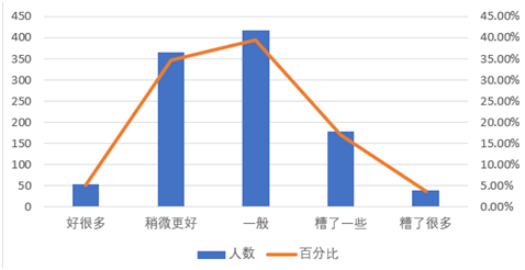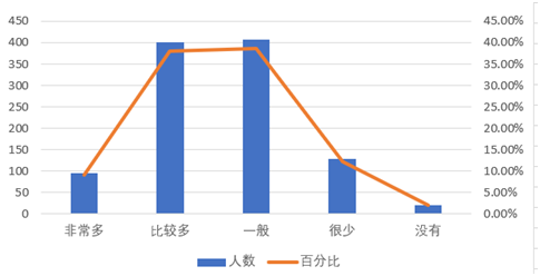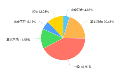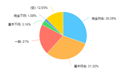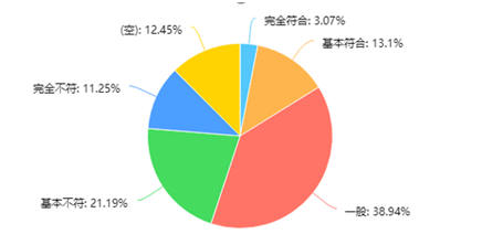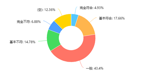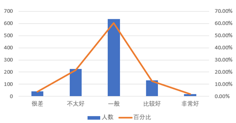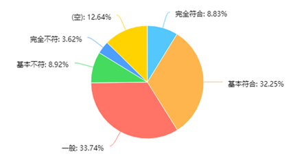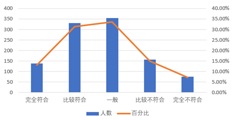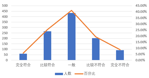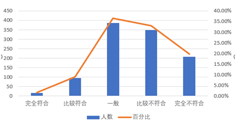 我们将两道题的选项予以赋分,选择“完全不符合”、“基本不符”、“一般”、“基本符合”和“完全符合”分别赋值0、1、2、3、4,然后将两道题的得分相加。可以看出得分较好的仅占1/5,较差的占比近19%,60%处于中等水平。