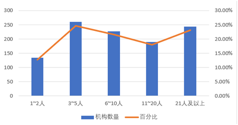 受访者所在机构全职员工1-5人的占比38.38%,6-10人、11-20人、21人及以上的机构,占比都接近20%。小规模机构约占四成,其他规模比例分布比较平均。