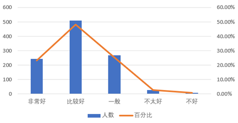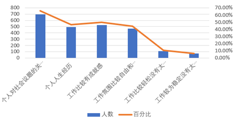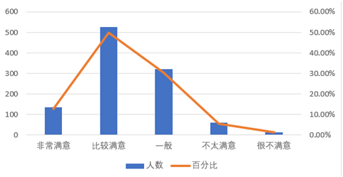 62.45%的受访者表示对目前工作“比较满意”或“非常满意”,明确表示“不太满意”或“很不满意”的仅有6.97%,另外30.58%认为“一般”。可见总体满意度较好,也存在相当比例中间状态者。