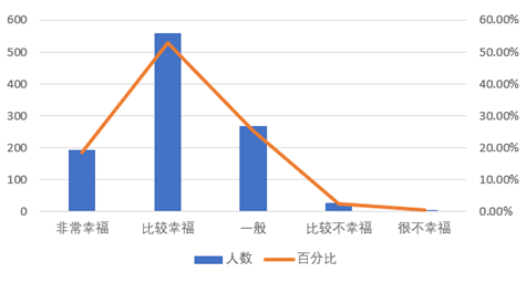 调查显示,71.44%的受访者认为自己幸福,其中“比较幸福”的占53.04%,“非常幸福”的占18.41%。认为自己“很不幸福”或“比较不幸福”的仅占约3%,可见我国公益从业者目前的总体幸福感是比较高的。