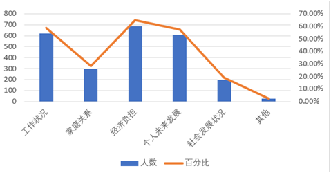 本次调研受访者中,91.73%存在心理压力,其中超过50%的心理压力较大。经济负担(66.26%)、工作状况(60.09%)、个人未来发展(58.2%)是三个主要的压力来源,经济负担居首。