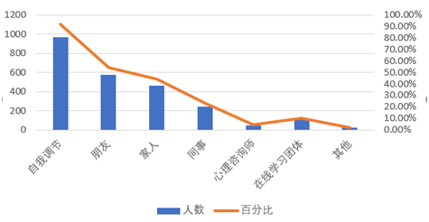 在情绪调节上,绝大部分(91.91%)受访者仅靠自我调节,依靠朋友或家人调节的,仅占半数。而选择心理咨询师的只有4.46%。