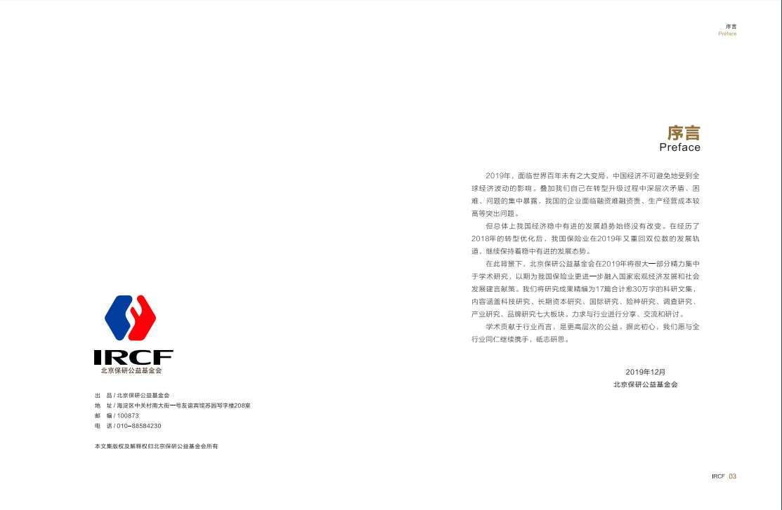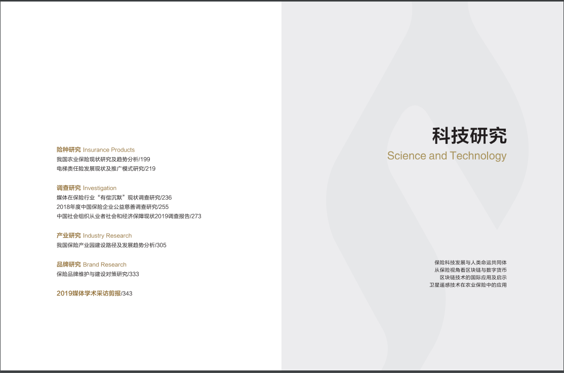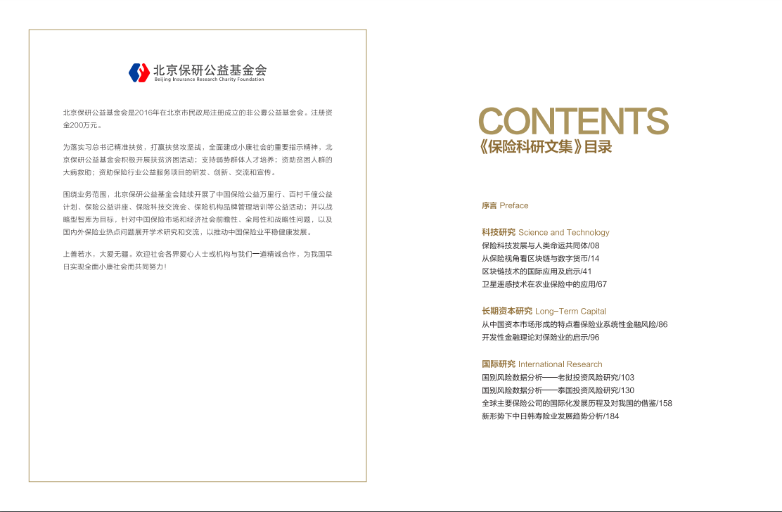 在此背景下,北京保研公益基金会在2019年将很大一部分精力集中于学术研究,以期为我国保险业更进一步融入国家宏观经济发展和社会发展建言献策。我们将研究成果精编为17篇合计愈30万字的科研文集,内容涵盖科技研究、长期资本研究、国际研究、险种研究、调查研究、产业研究、品牌研究七大板块。力求与行业进行分享、交流和研讨。