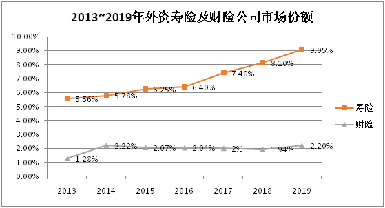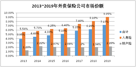 虽然外资保险公司进入中国已有20多年的时间,但是,就市场份额来看,外资保险公司市场份额一直处于劣势。2013~2019年外资保险公司寿险原保费收入占中国的整个市场份额,基本保持在6%左右,近两年有所好转,2019年达到9.05%左右。尤其是外资产险市场份额,比例更低。这其中既有对产品经营范围、股权结构严格监管限制的原因,也有外资保险公司自身经营的因素。
